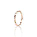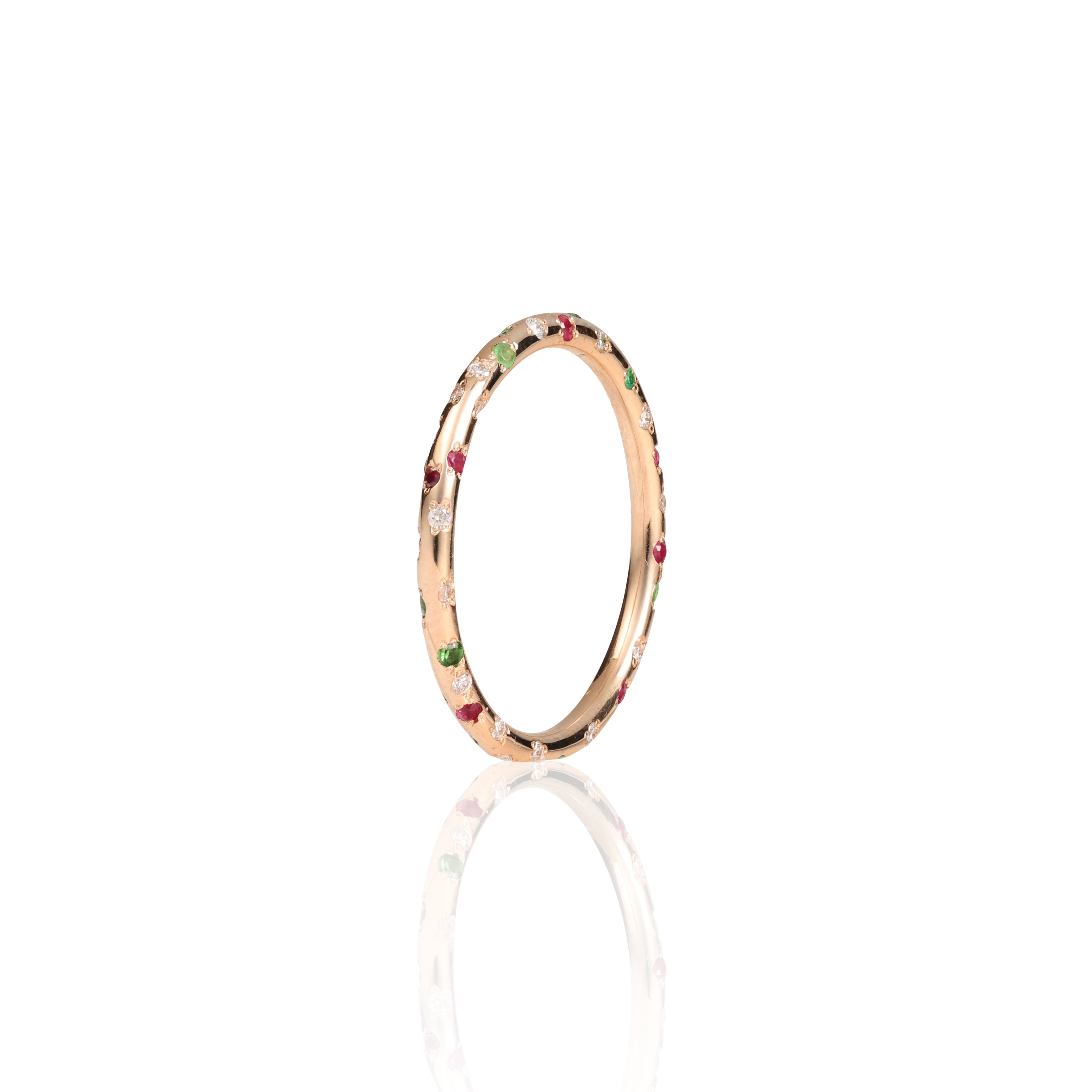 Step into a world of vibrant elegance with the Garden Ring from Fourmi Jewelry. This exquisite ring is adorned with 0.26cts of rubies, emeralds, and diamonds, creating a beautiful mosaic of colors that dance around your finger. The delicate band is crafted from luxurious gold, providing a perfect backdrop for the sparkling gemstones.
