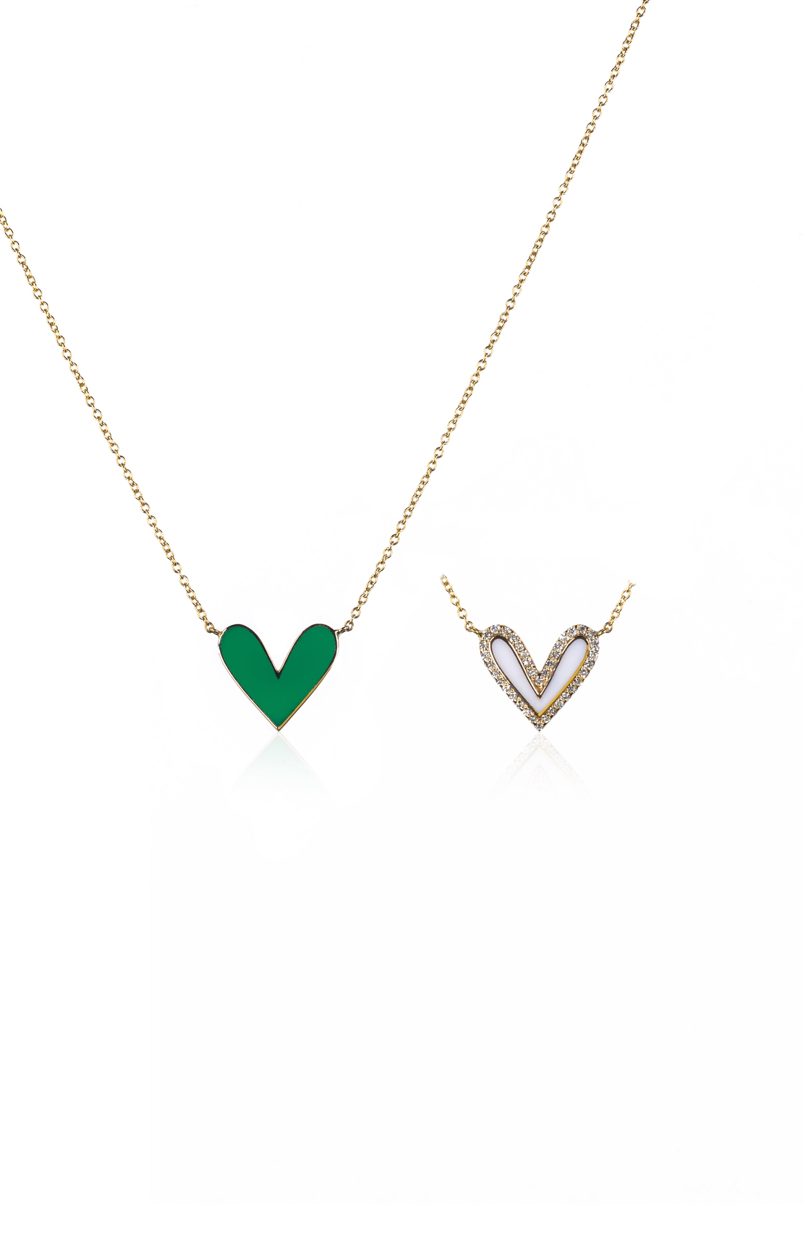 • Design: Dual-sided heart pendant with green enamel front and diamond-studded back
