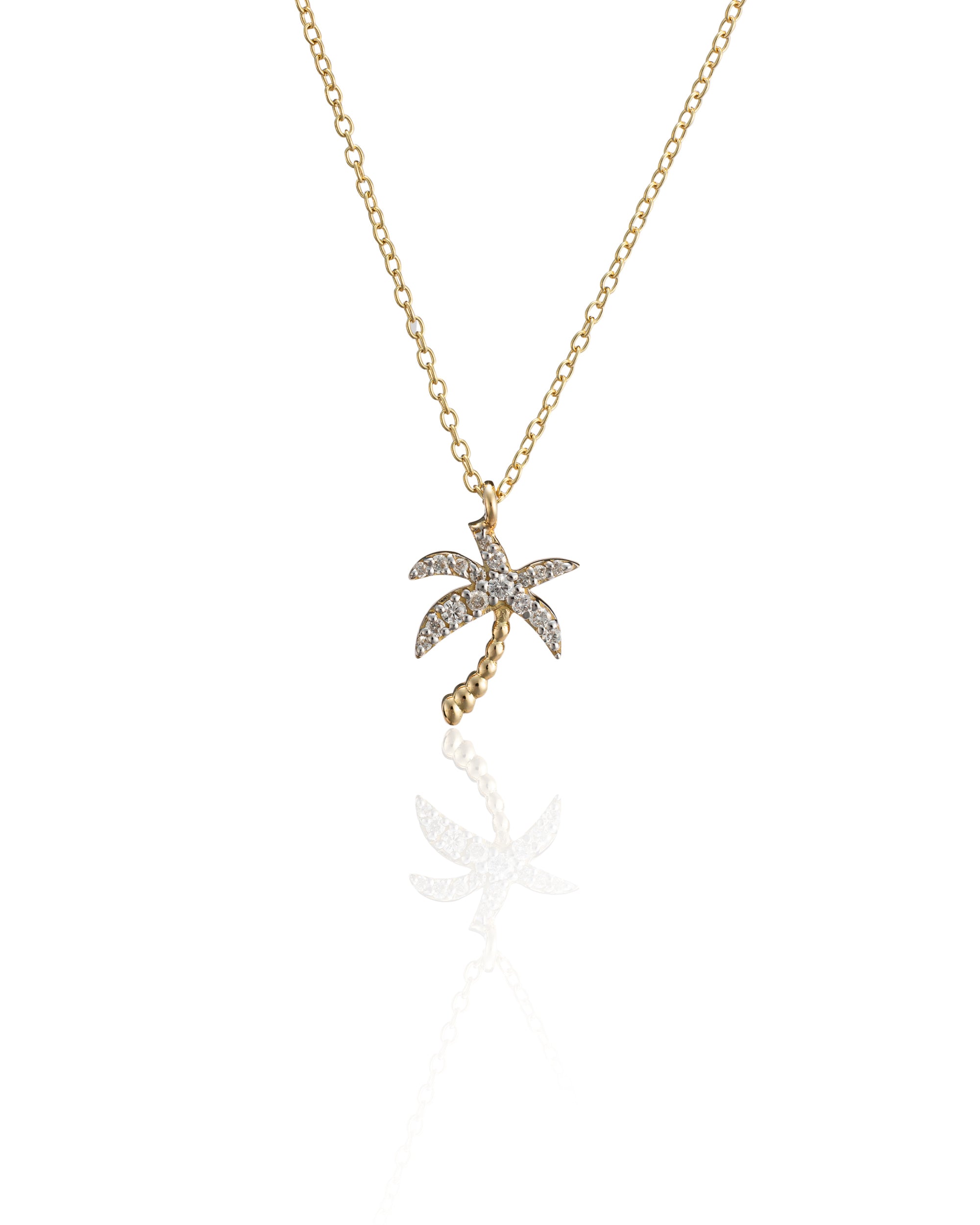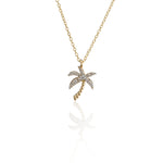 Capture the essence of tropical elegance with the Palm Pendant Necklace. This charming piece features a delicate gold chain adorned with a stunning palm tree pendant encrusted with sparkling diamonds, perfect for adding a touch of sunshine to any outfit.